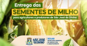 A Prefeitura de São José do Divino, por meio da Secretaria Municipal de Agricultura e Abastecimento, inicia, a partir do dia 13 (terça-feira), a entrega de sementes de milho para agricultores e produtores rurais do município. A distribuição ocorrerá das 8h às 12h, na Secretaria de Agricultura, localizada no centro da cidade, próximo à Prefeitura, enquanto houver estoque disponível. Para receber as sementes, é necessária a apresentação de CPF e CAF.
