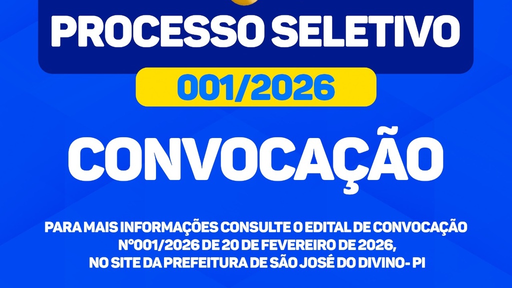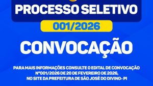 A Prefeitura Municipal de São José do Divino torna público o Edital de Convocação nº 001/2026, referente ao Processo Seletivo Simplificado nº 001/2026, convocando os candidatos para apresentação da documentação necessária à contratação. O chamamento contempla os cargos de Profissional de Apoio Escolar e Professores nas diversas áreas da Educação Infantil e do Ensino Fundamental […]