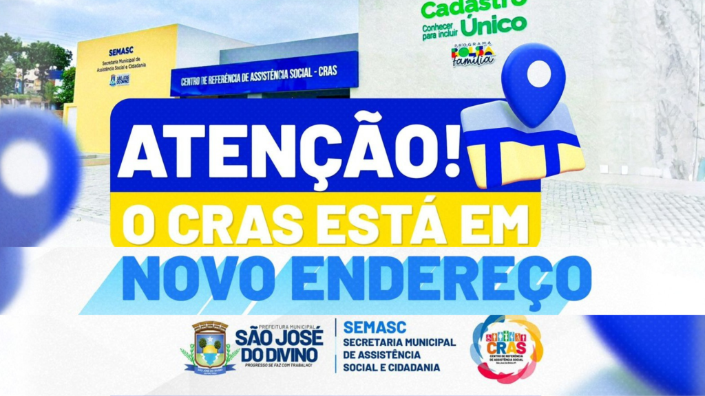 O Centro de Referência de Assistência Social (CRAS) de São José do Divino passou a funcionar em novo endereço, localizado na Rua Paulo Rodrigues de Sampaio, nº 365. O atendimento ao público ocorre de segunda a sexta-feira, das 7h às 13h.