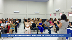 A Secretaria Municipal de Educação realizou, no dia 13 de novembro, mais uma capacitação com os profissionais de apoio das cinco escolas da Rede Municipal. O encontro contou com atividades práticas, festival de contação de histórias, apresentações musicais e demonstrações desenvolvidas pelos cuidadores, sob condução da neuropsicopedagoga Hisraele Veríssimo.
