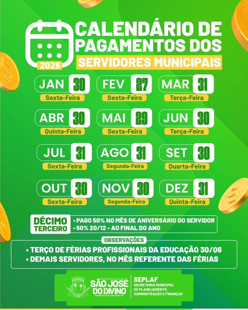 A Prefeitura de São José do Divino divulgou o Calendário de Pagamentos dos Servidores Municipais referente ao ano de 2026. O cronograma contempla todo o exercício financeiro e permite que os servidores acompanhem, com antecedência, as datas previstas para o recebimento dos vencimentos.