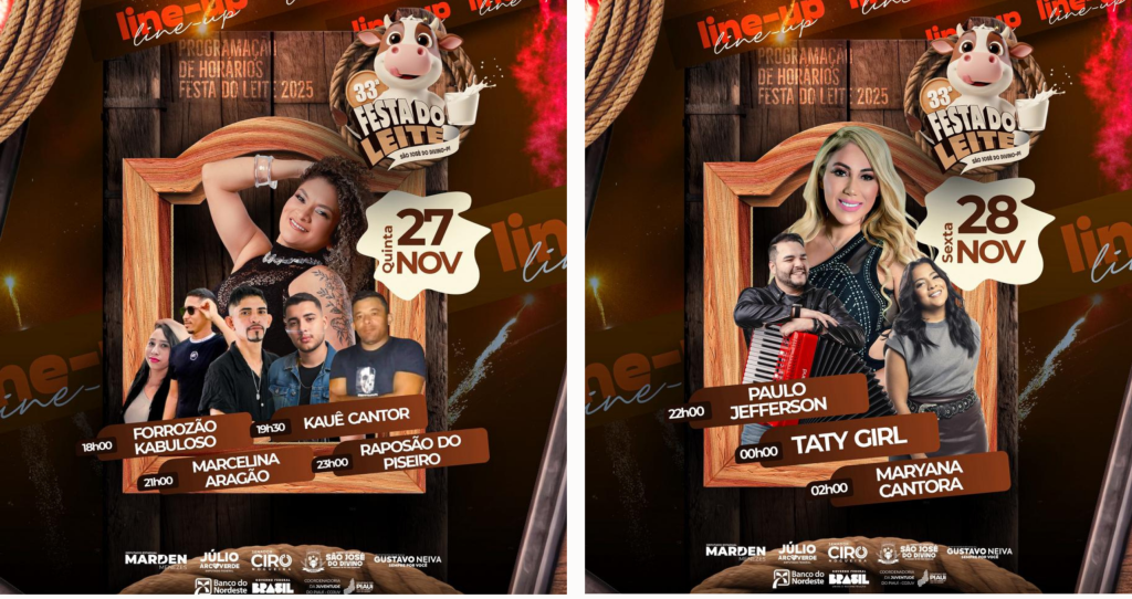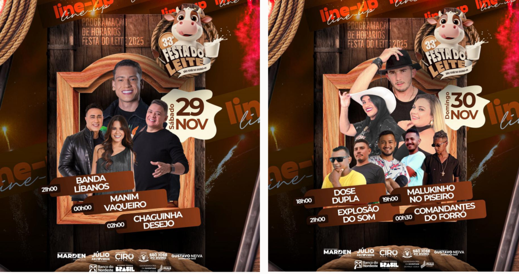 À noite, o evento segue com o Desfile das Rainhas com trajes típicos, seguido dos shows de Banda Líbanos, Manin Vaqueiro e Chaguinha & Desejo Musical, prometendo agitar o público na Arena da Festa do Leite.