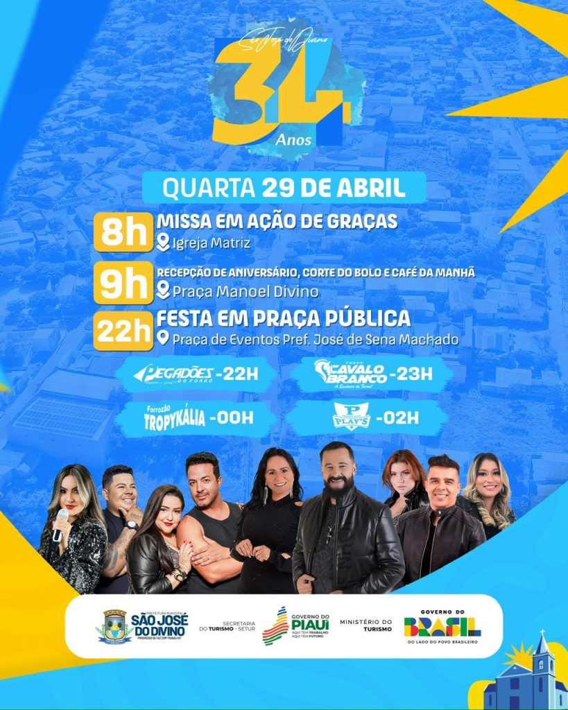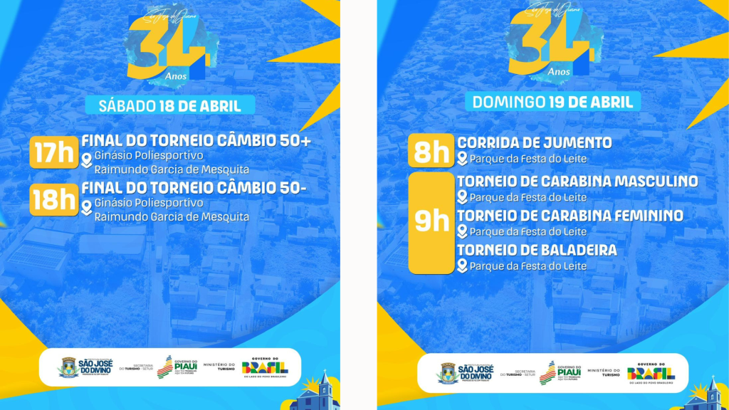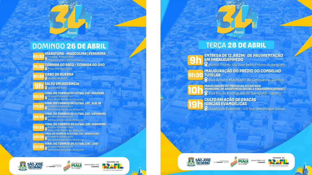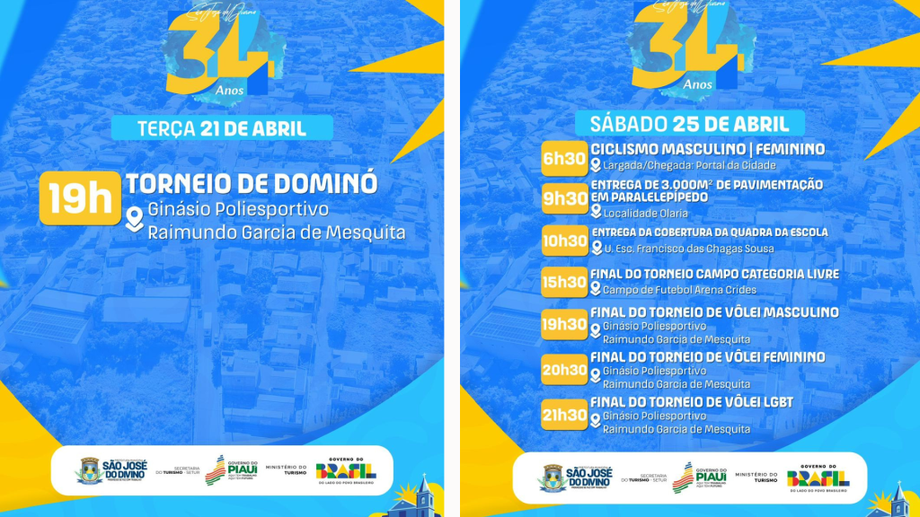 O município de São José do Divino realizará, ao longo do mês de abril, a programação alusiva aos 34 anos de emancipação política, com atividades esportivas, culturais, religiosas e institucionais.